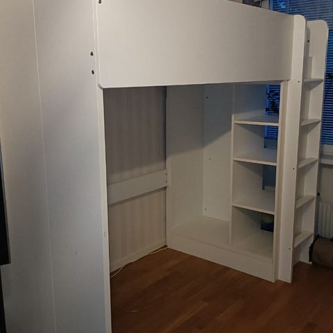 IKEA SMÅSTAD loftsäng med integrerat skrivbord och förvaringslådor. Sängen är vit och designad för att optimera utrymme i barnrum eller mindre rum. Inkluderar stege och hyllor för extra förvaring. Madrass ingår. 2 år gammal men använd väldigt lite. Som ny. Nypris ex madrass är 6000kr.
