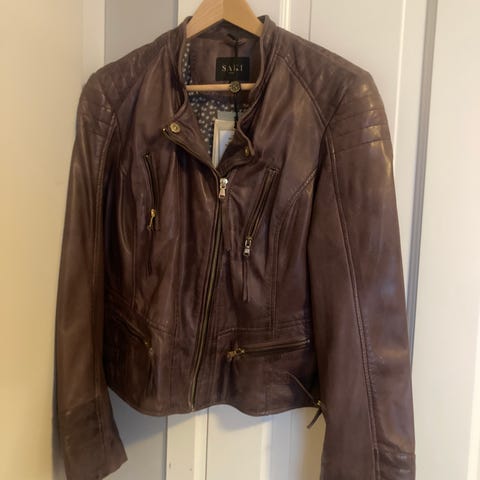 Brun läderjacka för kvinnor i storlek M. Jackan är tillverkad av läder och tillhör kategorin övriga jackor. Passar för vardagligt bruk och kan kombineras med olika klädstilar.