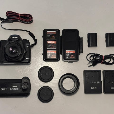 Canon 5D mark ii, inklusive 50 mm objektiv, 64 GB minneskort, extrabatterier mm