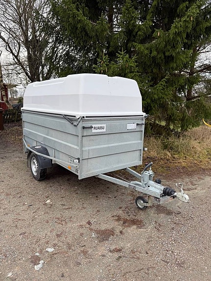 Professionell släpvagn för anläggnings- eller byggarbete som du vanligtvis hittar på bensinstationerna, med låg tyngdpunkt för högre säkerhet och stabila köregenskaper.
