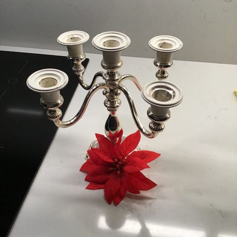 ljusstake tillverkad i en kombination av marmor och metall. Ljusstaken har en dekorativ design med detaljer i metall och en bas av marmor. Passar för standardljus och kan användas som en inredningsdetalj i olika rum.