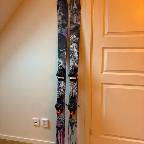 Säkjer nu mina snygga, spänstiga och snabba skidor som jag har haft i tre säsonger. Skidorna är av K2 Reckoner 102 2023 modellen med Marker Griffin bindningar. Skidorna är bäst på park, offpiste och funkar även för carving på pist (men är inte designade för det). Bindningen sitter i mitten av skidan så att den ska flyta bättre på puder snö och åka bakåt.