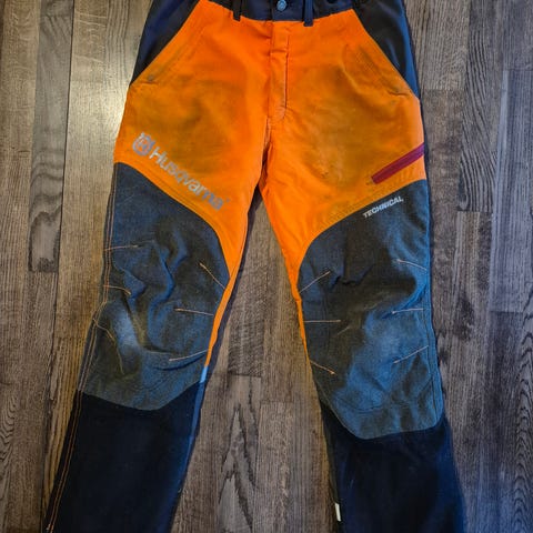 Husqvarna Classic sågskyddsbyxa huggarbyxa. Storlek: 54. Liten rispa i benet som syns på bilden men som inte har gått igenom helt. Inget annat utöver det. Använda och insmutsade. Skickar med hängslen och lagningslapp för tyget.