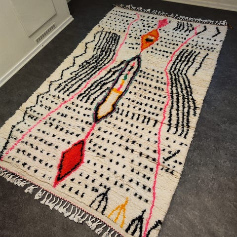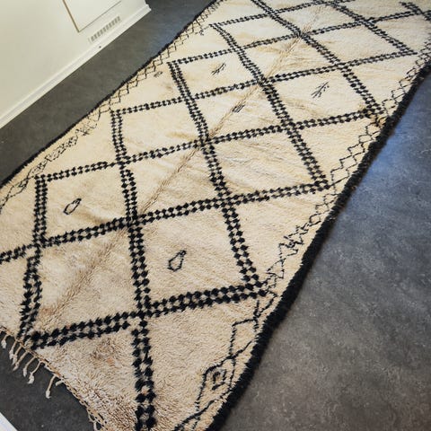 Skapa en varm och stilren känsla i ditt hem med en handknuten Beni Ourain-matta, tillverkad av naturlig, obehandlad ull av berberkvinnor i Atlasbergen.