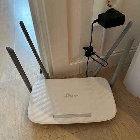 D-Link R15 Router med trådlös nätverksanslutning. Enheten är vit och levereras med nätadapter.