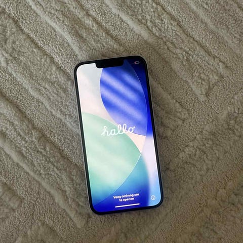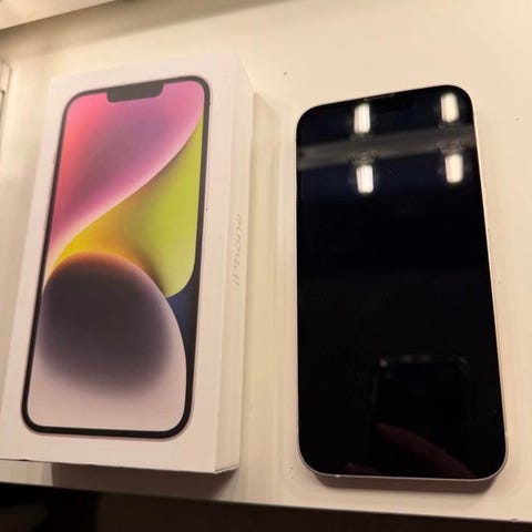 Iphone 14 med original förpackning, skal och skärmskydd.
