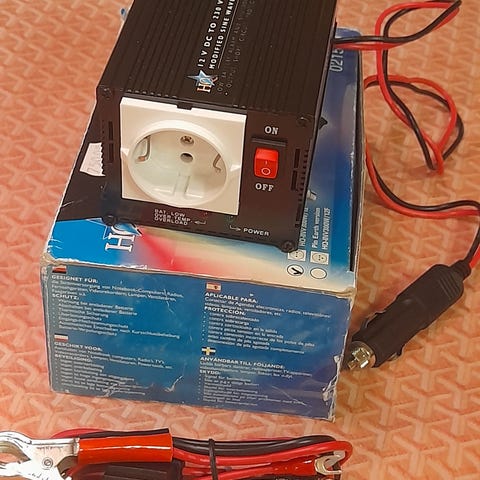 Inverter för 12-14v ”cigarettändaruttag” till 230V, 150 W. Har haft den liggande i bilen, så nästan oanvänd trots lite skavd i höljet av aluminium, se bilder.
