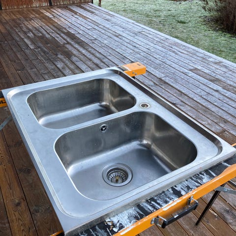 Rostfritt stål dubbelho diskbänk med två diskhoar och avlastningsyta. Passar för kök och rengöringsändamål.