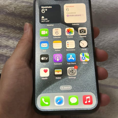 Mobilen är i mycket bra skick har haft skal och skärmskydd sedan start. Finns ett litet litet märke uppe på telefonen, men skärmen är repfri.
