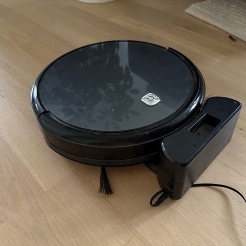 Eufy RoboVac 11S robotdammsugare med låg profil och svart färg. Utrustad med hjul för rörelse och en mikrofibermopp för våttorkning. Inkluderar laddningsstation för automatisk laddning. Designad för automatiserad golvrengöring.