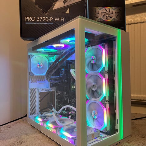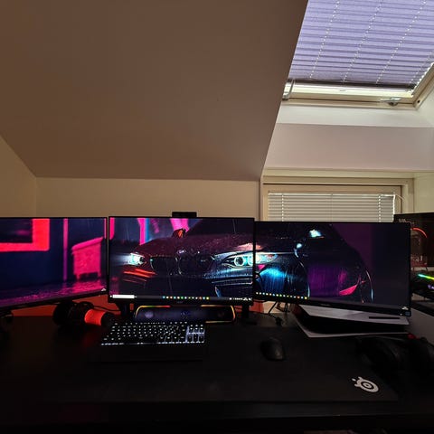 Säljer nu min kompletta setup. Pc, skärmar, skärm ställ, tangentbord, mus, musmatta. Kan även höra av mig med bordet om så önskas. Det är ett störr L bord. Som är fast skruvat i väggen så att det inte finns några ben. Om intresant skicka meddelande