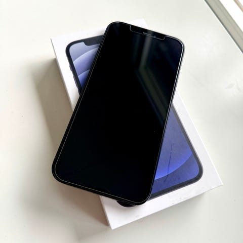 Apple iPhone 12 med 64 GB lagringsutrymme. Mobiltelefon med skärm som visar olika appar och inställningar. Enheten är vit och levereras med originalförpackning. Topp skick
