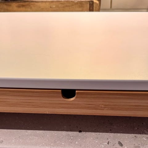 IKEA Förvaringslåda i vitt och brunt material. Lådan har ventilationshål och en öppning på toppen för enkel hantering. Passar för organisering och förvaring av exempelvis laddkablar.