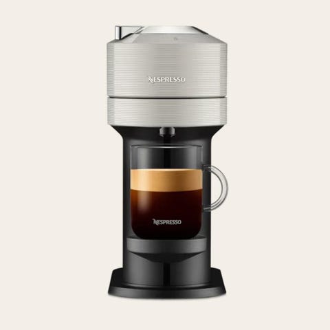 Nespresso Vertuo Next kaffemaskin i vit färg. Maskinen är utformad för att brygga kaffe med Nespresso Vertuo kapslar och har en kompakt design som passar i kök med begränsat utrymme.