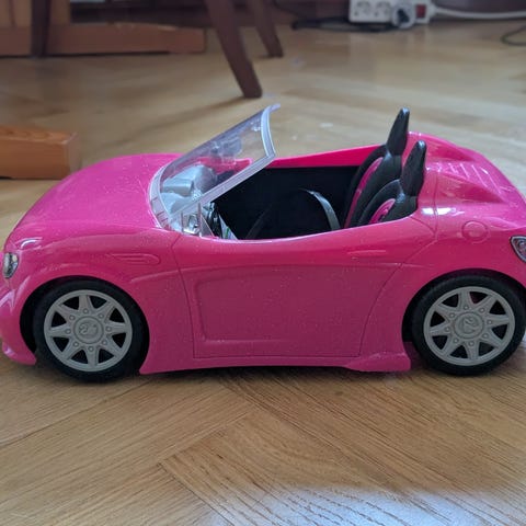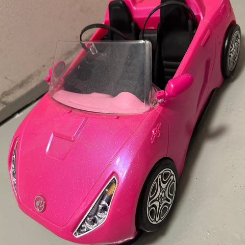 Barbie barnbil leksaksbil i rosa och lila färger. Tillverkad av plastmaterial och utformad för barnlek.