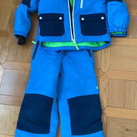 Grön/blå jacka och täckbyxor i storlek 150. Hämtas i Västerås.