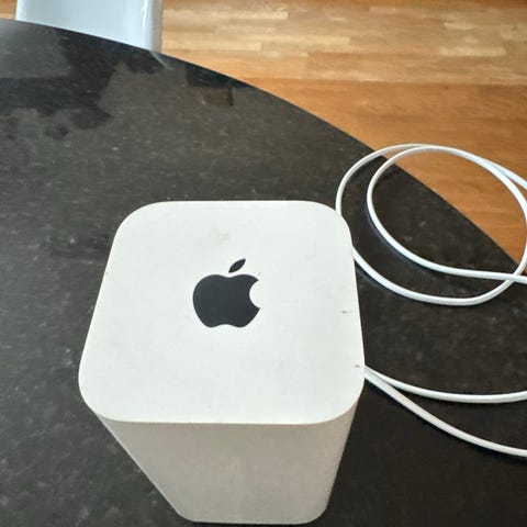 Apple Router med flera portar för nätverksanslutning. Enhet i vitt med svart Apple-logotyp. Designad för att hantera nätverkstrafik i hem eller kontor.