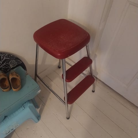 Röd sparkstötting tillverkad i metall ock trä Utrustad med sittbräda. Designad för vinterbruk på snö och is. Är 84 cm hög