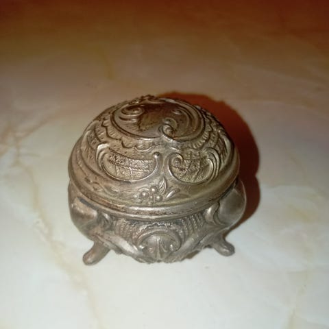 I metall. Man kan ha smycken eller andra minnessaker. Från Tyskland år 1900-1919.