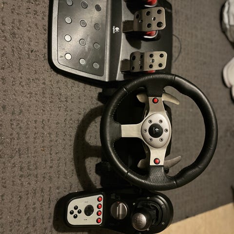 Logitech G25 bilsimulatorer. Inkluderar tre pedaler (koppling, broms, gas). Används för realistisk körsimulering på dator.