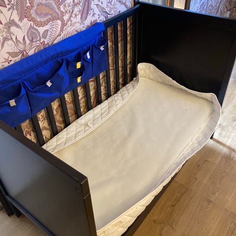 Madrass medföljer (HIMLAVALV från IKEA, nypris 1495kr). 60 x 120 cm. Går att ta av överdraget på madrassen.