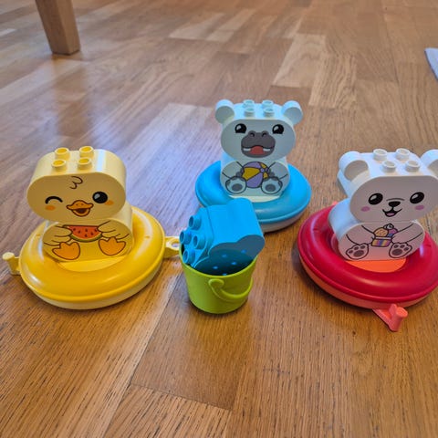 leksaksbåtar i plast i färgerna röd, blå och gul. Setet består av tre båtar i olika färger, lämpliga som leksaker för barn.