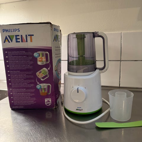 Topcom Baby Bottle Warmer för uppvärmning av nappflaskor. Produkten är vit med lila detaljer och har en enkel vredkontroll för temperaturinställning. Passar för användning med olika flaskstorlekar.