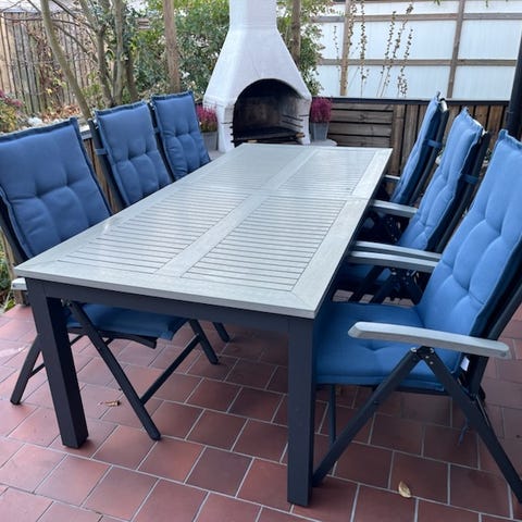 Stabilt bord och lätta stolar som är sköna att sitta i.