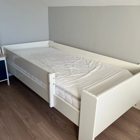 IKEA enkelsäng i vitt trä. Passar för barnrum och har en enkel och funktionell design. Sängen är anpassad för ett barn och är lämplig för enkel användning.