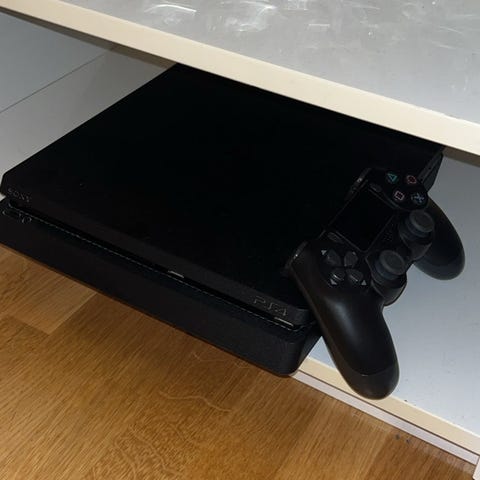 Sony Playstation 4 spelkonsol i svart färg. Inkluderar handkontroll och nödvändiga kablar för anslutning och strömförsörjning.