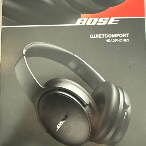 Bose QuietComfort hörlurar i grå färg. Trådlös över örat-design med justerbar huvudbygel och inbyggda kontroller för volym och uppspelning. Levereras med hårt fodral för förvaring och transport.