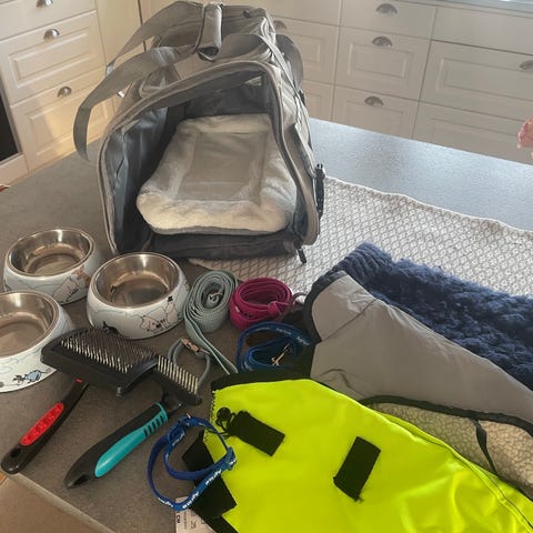 Allt för bilresan, baksätesskydd, godis, ventilationskrok, skål, fäste för bälte, reflex, bajspåsehållare, med påsar, leksak, ryggsäck för att lägga allt i. Kan tas till Göteborg eller skickas. En kvar. Kan anpassas i storlek för alla hundar med tillbehören