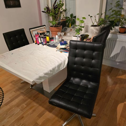 Skicket är hyfsat. Det finns 3 sprickor i klädseln på sittdynan på ett och samma ställe (se sista bilden), men inget som påverkar funktionen.