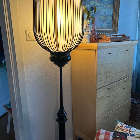 Populära golvlampan Evedal med följande info: Design: Lampan är inspirerad av skandinavisk design från mitten av 1900-talet och beskrivs som tidlös och genuin i både form och material. Kombinationen av mässing, glas och trä ger den en lyxig känsla.