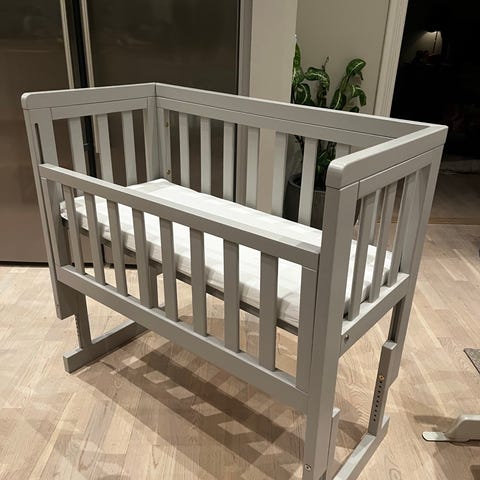 Helt oanvänd beside crib med madrass samt nytt underlakan.