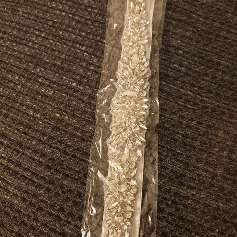 Bälte med maxglans: Ett brett mönster av stora, klara strasstenar monterat på ett vitt satinband som knyts runt midjan.