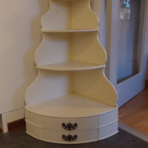 Hylla som är mysig att ställa ljus i. Kollar man noga så är det lite penseldrag på ovansidan