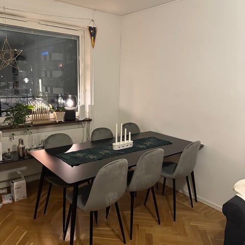 Bordet är köpt i maj 2025. Så i absolut nyskick. Inga repor osv. Säljer matgruppen eftersom jag ska flytta till lägenhet och då finns det tyvärr inte plats för denna stora matgrupp. Perfekt till den stora familjen :) stolarna är sköna att sitta på och jätte lätta att torka av om man har små barn eller är klumpig själv ;).