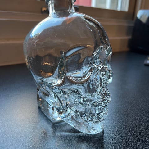 Flaskan har en fyrkantig form och är tillverkad av blått glas. Den är försedd med en metallkork med dekorativa detaljer.