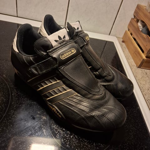 Ett par Adidas Samba skor i vit färg med svarta detaljer. Klassisk modell med tre ränder på sidan och brun sula. Storlek 43.5 .