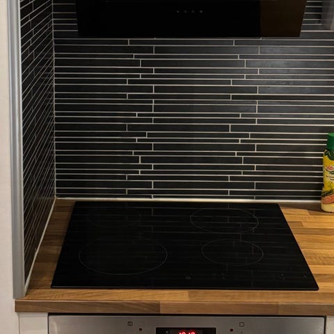 IKEA Induktionshäll, ugn, köksfläkt, diskmaskin och väggstänkskydd i glas som är 209x35
