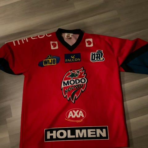 Tröjan har långa ärmar med vita detaljer. Material och storlek är inte specificerade.