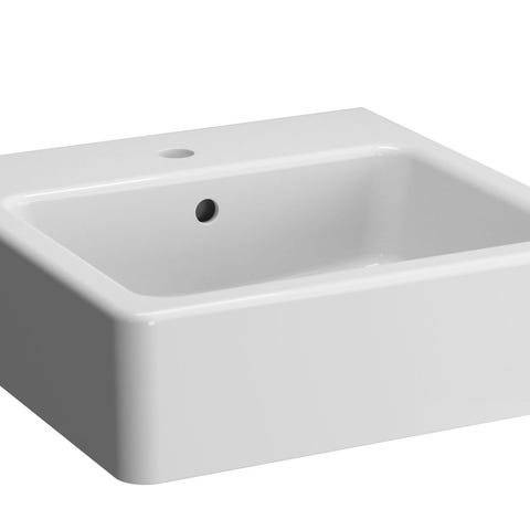 Nytt Alterna Piazza tvättställ med måtten bredd 500 mm, djup 500 mm och höjd 150 mm. Tillverkat i vitt material. Designat för användning i badrum.