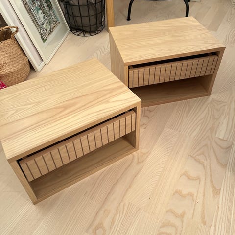 Efter montering och flytt insåg vi att de är för stora för sovrummet, så de har aldrig använts som sängbord.