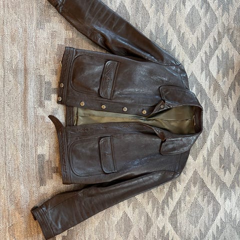 Kort läderjacka i läder. Blixtlås fram samt på bröstfickorna. Något insvängd i midjan. Inköpt mitten 90-tal på JC.