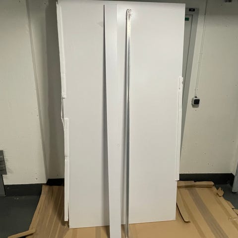 NorDan skjutdörr med tillhörande monteringssats. Dörren levereras i delar med beslag och skruv samt monteringsanvisning för skjutdörr. Passar som innerdörr eller rumsavdelare beroende på mått och montage. Färg, exakta mått och material framgår inte av bilderna och bör kontrolleras vid intresse.