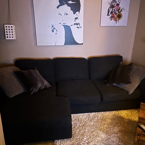 Stor och bekväm soffa i mörkgrå färg. Använd men i bra skick. Det finns en liten skada (bild 3) men inget som påverkar funktionen. En fot saknas i mitten också.