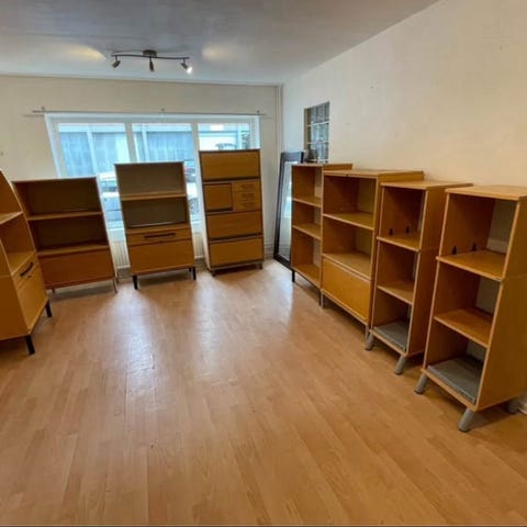 Har några höj sänkbara skrivbord, stolar, skåp, koferensbord, whiteboard osv.