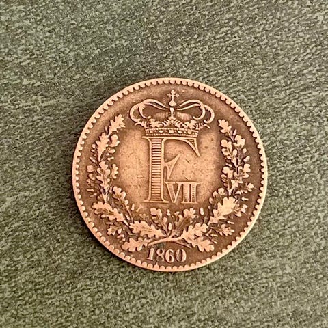 Danska mynt med valören 1 skilling. Myntet har detaljerade mönster och inskriptioner på båda sidor. Tillverkat i metall med en rund form.