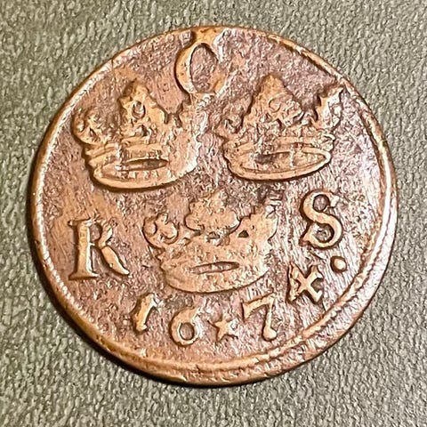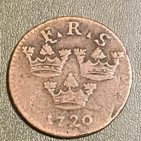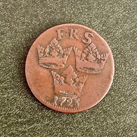 Mynt 1 Öre från Sverige, år 1718, tillverkat i koppar. Myntet visar detaljerad präglad design på båda sidor.